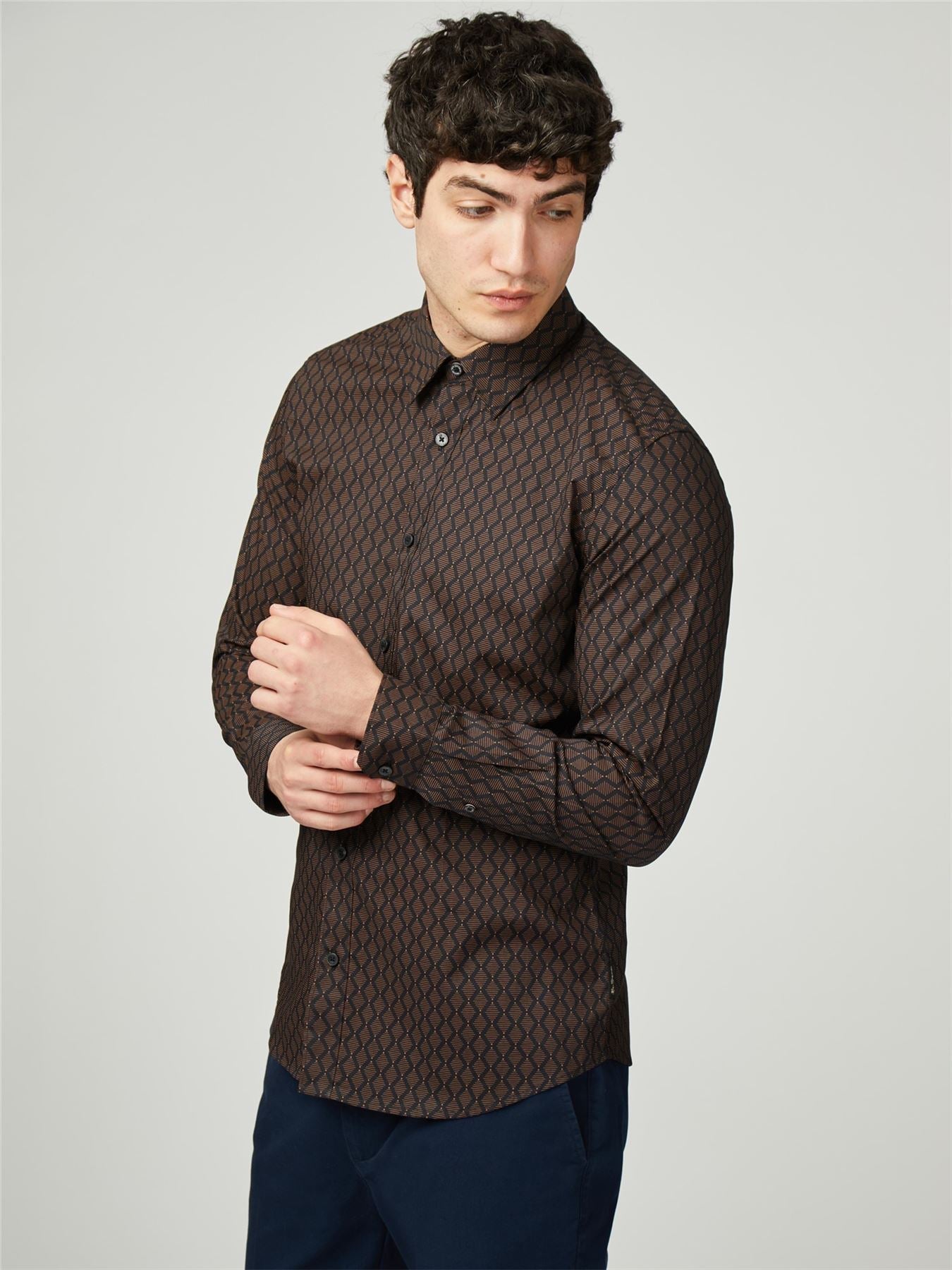 Ben Sherman Big Size Linear Geo Print Long Sleeve Shirt For Men in Black, 2XL-5XL -